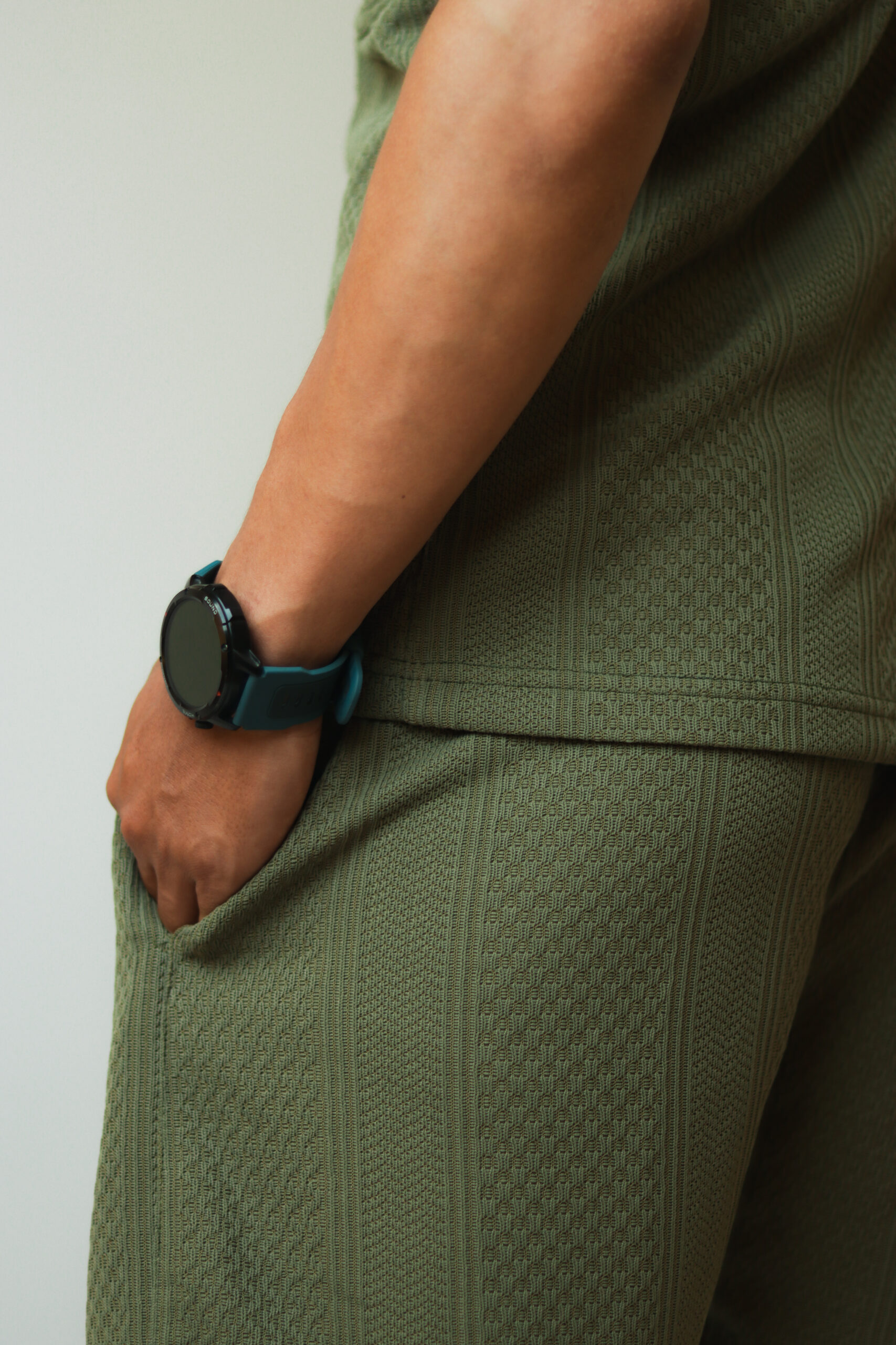 This Olive Green Jacquard Set is your go-to for effortless dressing. The Cuban collar shirt and relaxed shorts are tailored from a textured jacquard knit fabric that elevates your outfit while keeping things light and breathable. Rock it with sneakers and sunglasses for that perfect off-duty look.